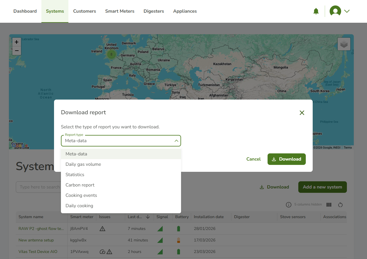 The Download Reports feature allows you to export data from multiple Biogas Systems in CSV format for further analysis.